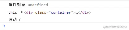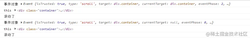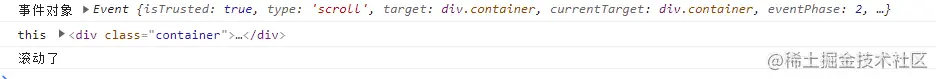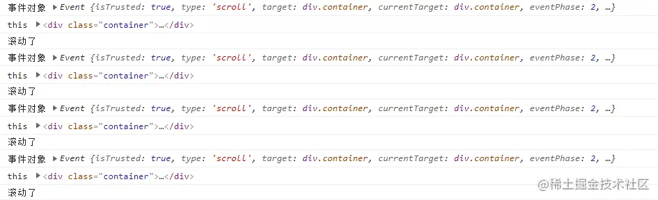 轻轻滚动一下,控制台只输出了一次。观察输出的内容,发现如下问题: