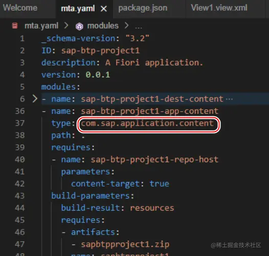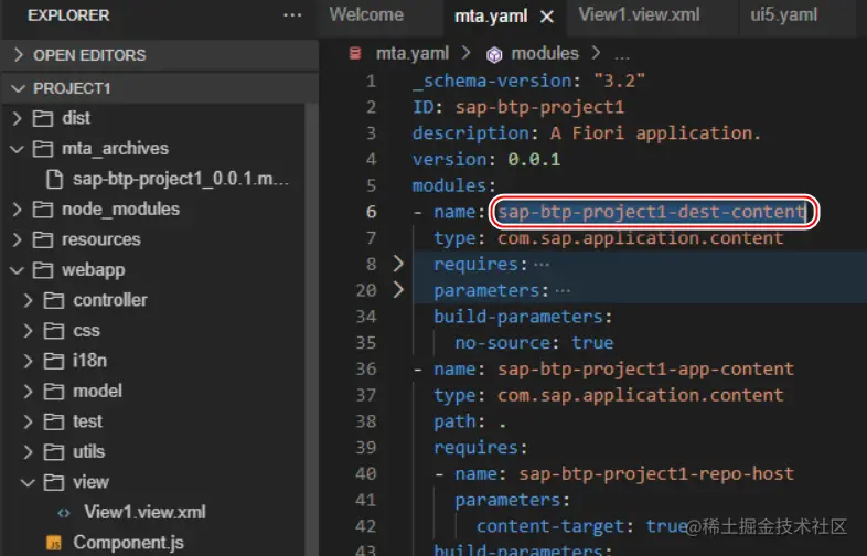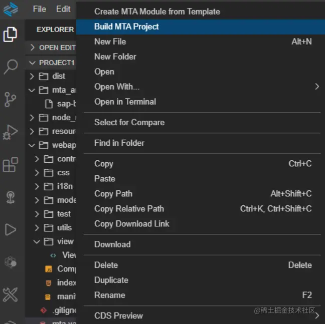 SAP Business Application Studio 里打开一个 SAP UI5 应用,选中 mta.yaml 文件进行构建:Build MTA Project: