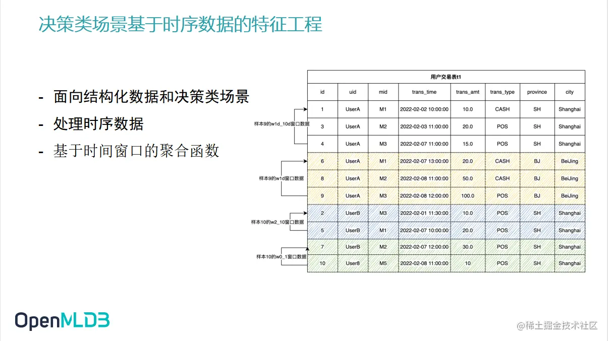 本次内容分享的背景之二是 OpenMLDB 所触发的应用背景。目前 OpenMLDB 面向的主要场景是决策类场景,是基于时序数据的这种特征工程。这里的关键词有三:
