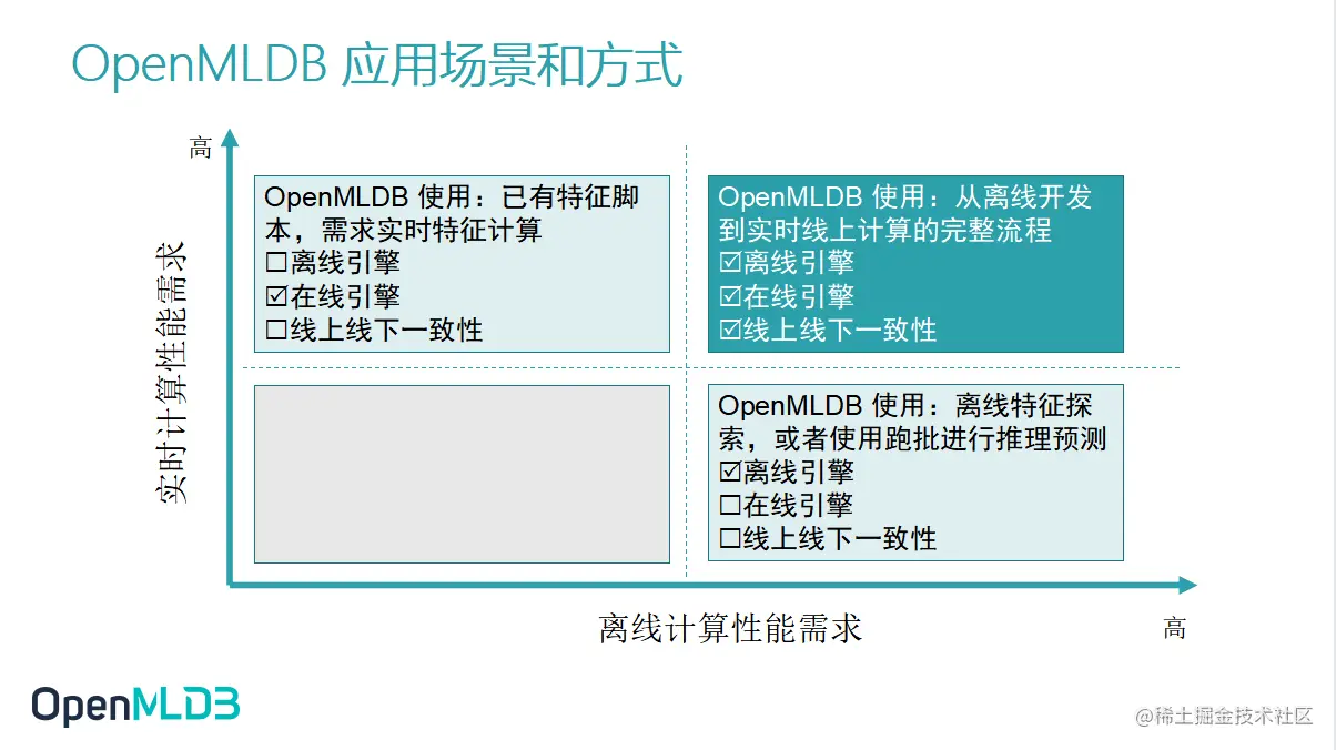 右上象限就是我们刚才提到的场景,需要从离线开发到实时线上计算的完整流程,可以用我们 OpenMLDB 完整的离线到实时上线流程去做这个开发和业务上线。这个过程中会用到我们的离线引擎和在线引擎,也能享受到线上线下一致性的功能,是我们认为的最典型的一种使用方式。