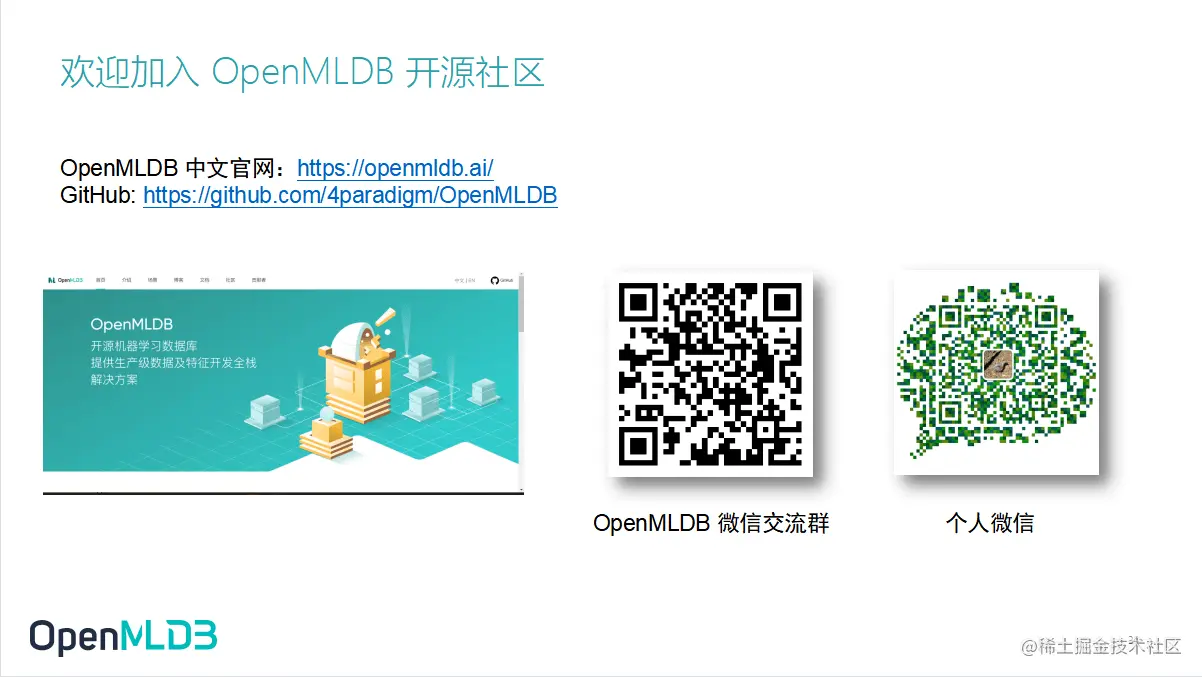 上次 Meetup 时,我预告了官网的上线。如今 OpenMLDB 官网已经顺利推出,欢迎大家访问。或者也可以访问我们的 Github 页面,加入我们的微信交流群,又或是我的个人微信探讨交流。