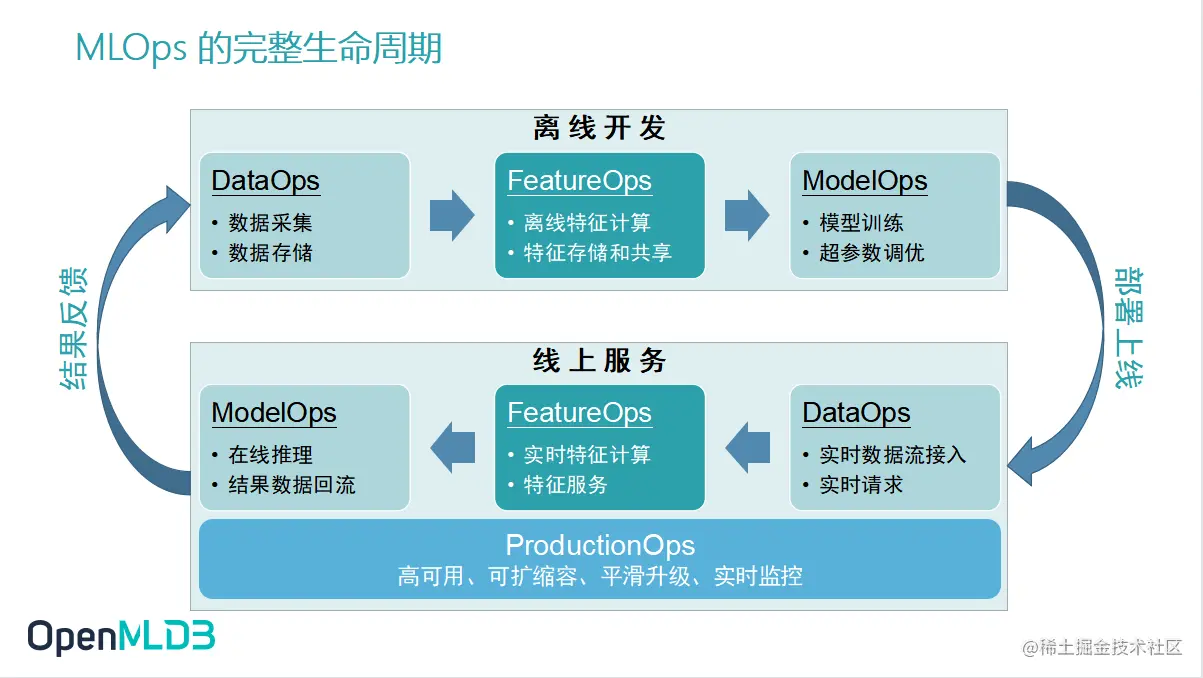 可以注意的是,画面下方线上服务部分这一块还加入了一个环节——ProductionOps,它是企业人工智能工程化落地时一个非常重要的环节。在生产环境之下,企业会非常看重高可用、可扩缩容、平滑升级、实时监控这些企业级核心。所以 ProductionOps 也是我们做 FeatureOps 过程中非常关注的内容。