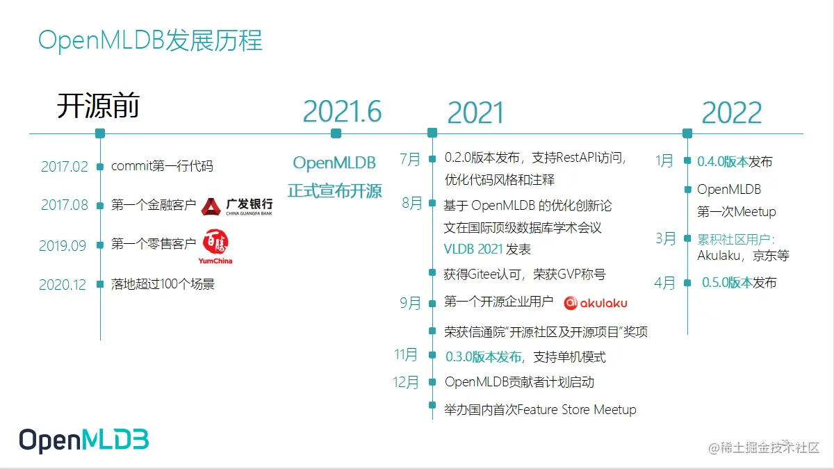 OpenMLDB 真正开源是去年的 6 月,我们其中的关键组件重新从商业平台中抽取出来,做了包装和优化形成了 OpenMLDB 今天的形态,并且对外开源,贡献给社区。我们开源后收获了不错的反馈,去年 9 月收获了第一个开源企业用户 Akulaku,今年我们也看到很多新团队在不断深入使用 OpenMLDB。