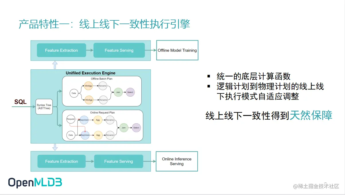 之前讲过的一致性执行引擎,其实就是在内部去把 SQL 做了一个转换,转换成线上的执行计划和线下的执行计划,保证这两个值是从定义和执行逻辑上都是一致的。等于说线上线下一致性是在 OpenMLDB 的内部得到了一个天然的保障。