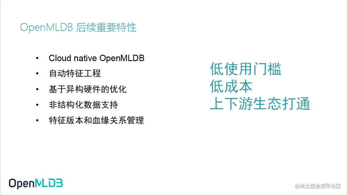 后续规划中 OpenMLDB 特性会朝着三个主要目标去走,三个主要目标就是降低使用门槛,降低使用成本,以及跟上下游生态的打通。