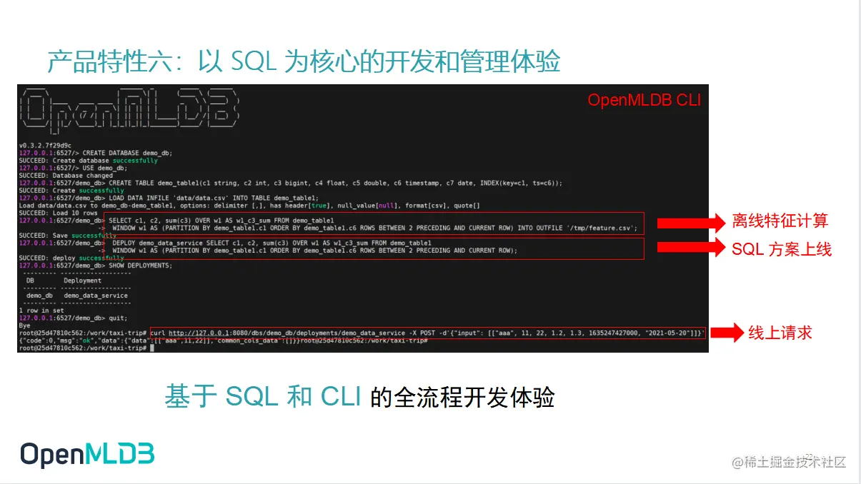 最后给大家分享一下这个 OpenMLDB 的一个非常重要的使用方式。我们认为它是一个数据库,最中心的一点就是 OpenMLDB 是以 SQL 为核心的全流程开发和管理体验,在 CLI 里面去做离线特征方案的开发,开发完离线特征计算,可以一步切换到这个SQL的方案上线,直接用一个 DEPLOY 命令把离线的方案切换到线上,就可以直接进入 serving 的服务。然后按步骤操作,就可以直接做线上请求,进行实时特征计算了。