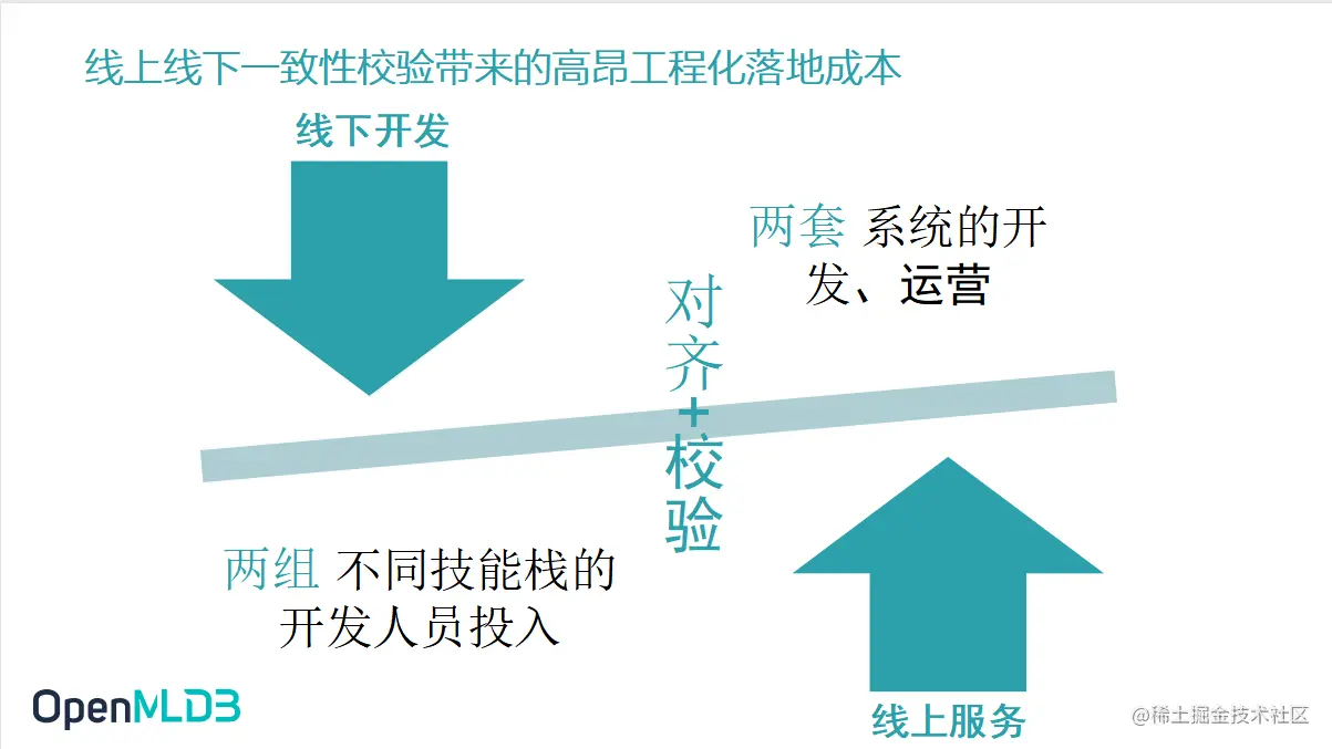 计算逻辑一致性校验,简单来说就是数据科学家和工程化团队生产的模型的精度需要达成一致。最本质问题在特征计算方面,要保证特征抽取的计算逻辑一致。这个地方大家可能听起来很简单,但实际上做起来是不容易的,对齐联调所需要的人力成本、测试成本和修护成本非常庞大。在我们以往的客户服务实践中,一次性校验往往花费数月甚至接近一年的时间去反复校验。而投入大量成本去反复验证,自然是因为线上线下经常出现不一致性。