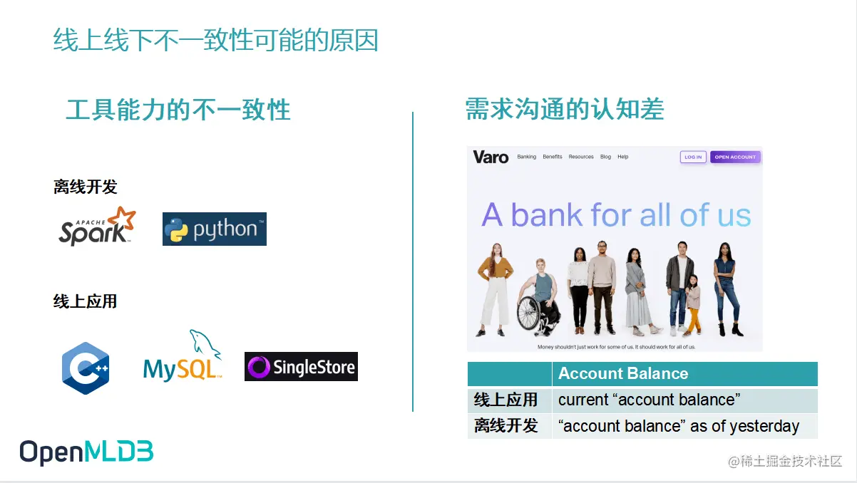 这里我们举一个例子,Varo,一家非常有名做线上银行的公司,在美国有很多的用户,他们的工程师提到了需求沟通认知差的问题。关于如何定义account balance,他们就有一个教训。工程化团队认为这个 account balance 即是上线以后实时的账户余额;但是数据科学家团队为了简化,而采用了昨天结束时候的账户余额。很明显两者之间的认知差,就能造成后面的整个训练效果的不一致性,从而导致了他们的应用里出现了非常严重的线上业务问题。其实不光是这家银行,在第四范式整个项目实践的周期经验当中,我们都或多或少都碰到过这种沟通认知差带来的问题。一旦出现这种问题,排查的成本其实还是非常高的。