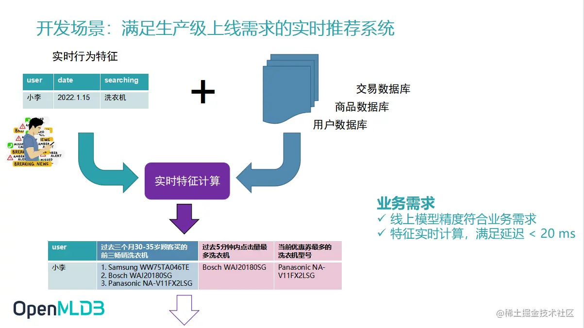 以实时推荐系统为例,比如小李同学,在某个时间点想买洗衣机,去搜索洗衣机,触发了搜索行为以后,后面整个特征计算会做什么?首先进来的实时行为特征,这三个原始的特征就是 User ID,日期以及他在搜索的产品。如果我们只是拿这三个特征去做模型训练和推理,是达不到一个业务需求的模型精度的。