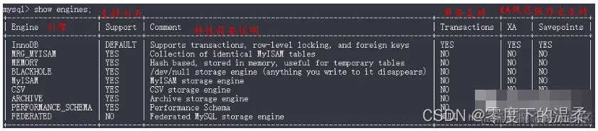 我本地安装的社区版MySQL,版本号为5.7.23,支持9种存储引擎或者说是8种(FEDERATED NO SUPPORT 不支持FEDERATED),而官网提供了10种存储引擎。本地与官网支持的存储引擎略微不同,个人估计是社区版和商用版的差别的缘故,或者是安装时候配置项设置导致的差异,有清楚的小伙伴还望告知一下。