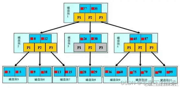 - 非叶子结点的指针:P[1], P[2], …, P[M];其中P[1]指向关键字小于K[1]的子树,P[M]指向关键字大于K[M-1]的子树,其它P[i]指向关键字属于(K[i-1], K[i])的子树;更多阅读:在100G内存下,MySQL查询200G大表会OOM么?