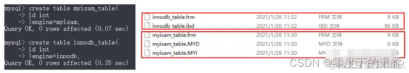 存储引擎是基于表的,以下分别使用MyISAM和InnoDB存储引擎建立两张表,看看其在文件系统中对应的文件存储格式。