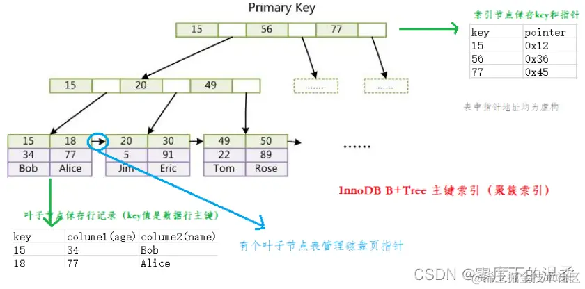 B+树 叶子节点包含数据表中行记录就是聚簇索引(索引和数据是一块的)。