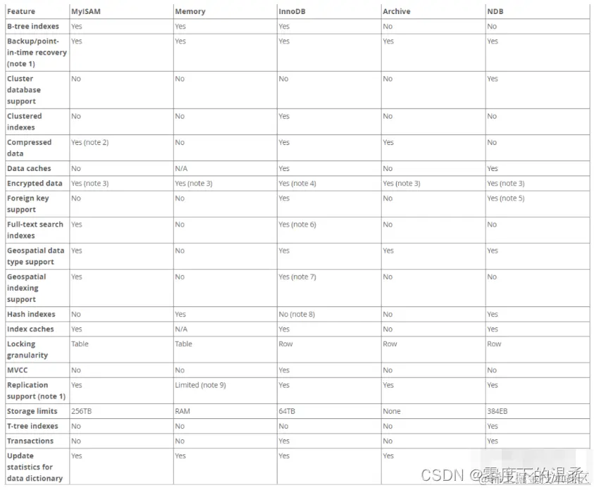 下文主要介绍InnoDB MyISAM Memory三种存储引擎,以下是三者简要特性对比
