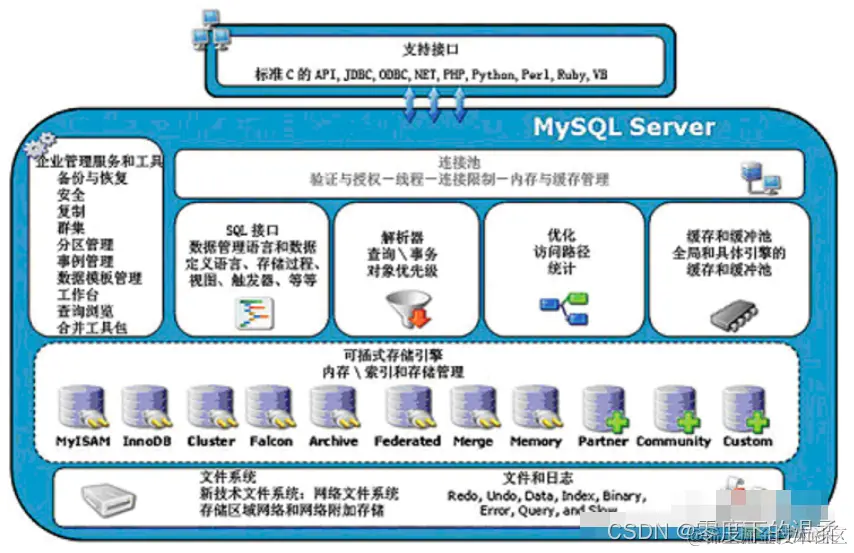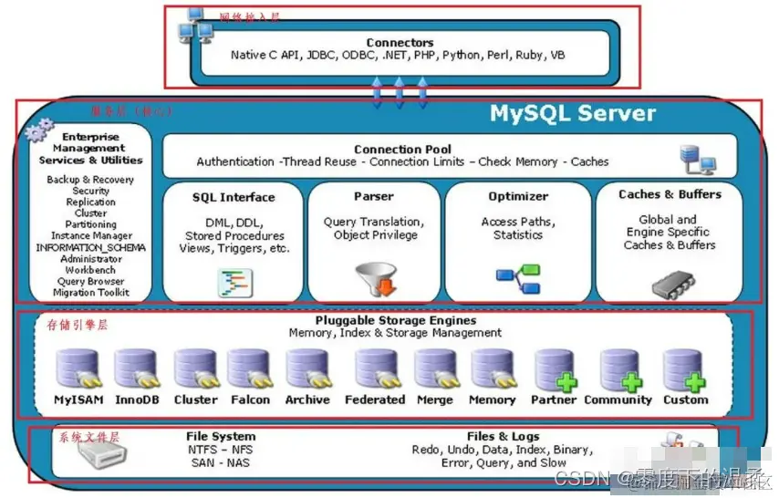 以下是官网MySQL体系构架图,我们稍微对其进行了层级划分。