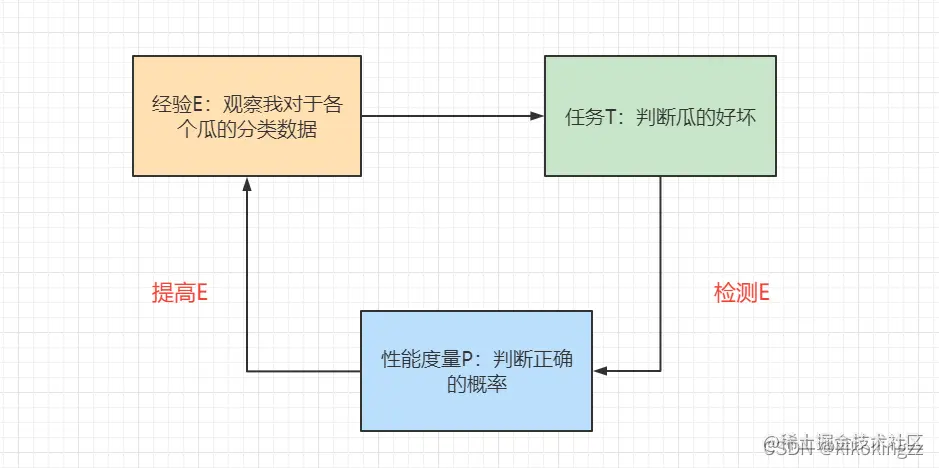 关于机器学习的另一种解释有:计算机会从经验E中学习,解决某一任务T,进行某一性能度量P,通过P测定在T上的表现,进而经验E提高,我们这边以一个买瓜的例子来解释。