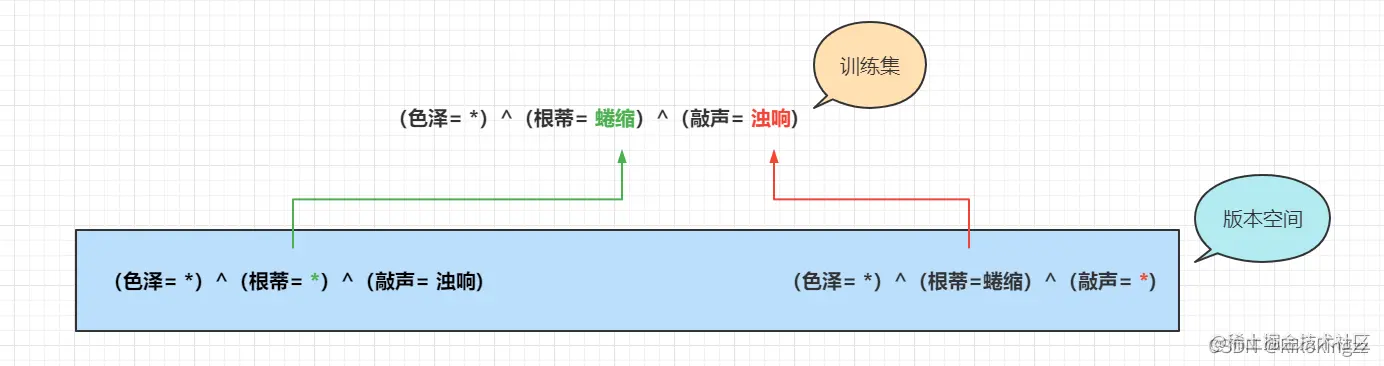 假设我们获得了上面这个训练数据集,我们学习的目标是“好瓜”;通过上表我们将“好瓜”的评判标准为“色泽”、“根蒂”、“敲声”这三个属性决定,因此我们用布尔表达式来写出“好瓜”与这三个属性之间的逻辑关系: