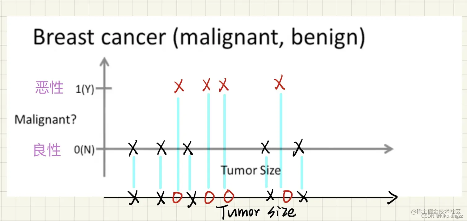 在分类问题中,我们可以用另一种方法来绘制这些数据。我们以肿瘤的大小(Tumor Size)作为衡量其恶性或良性的标准,用O代表良性,用×代表恶性,此时,我们只使用了一个属性——肿瘤的大小,来预测肿瘤是良性还是恶性的。