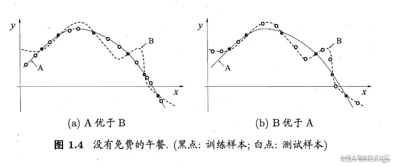 假设学习算法a基于“归纳偏好”产生了对应于曲线A的模型,学习算法b基于另一种“归纳偏好”产生了对应于曲线B的模型。基于奥卡姆剃刀原则,我们可能会觉得A模型比B模型更好,但事实真的如此吗?
