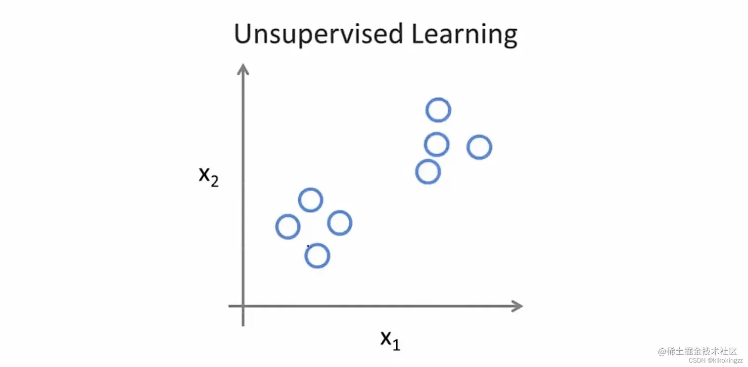 与监督学习不同的是,我们得到一个数据集(如下图),这些数据可能有相同的标签或都没有标签(下边的数据点都是蓝色⭕️),我们不知道要拿它来做什么,也不知道每个数据点究竟是什么,我们只知道这里有一个数据集,让计算机找出其中的结构。