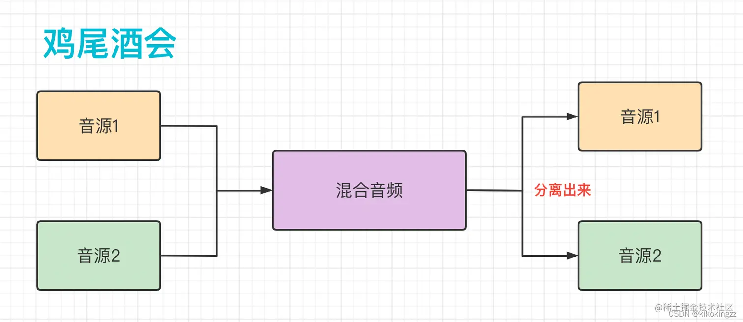 鸡尾酒聚会算法,就是可以将鸡尾酒会中的嘈杂声音,也就是将语音源1和语音源2的混合音频,通过鸡尾酒会算法分离出来,即重新分离为音源1和音源2。
