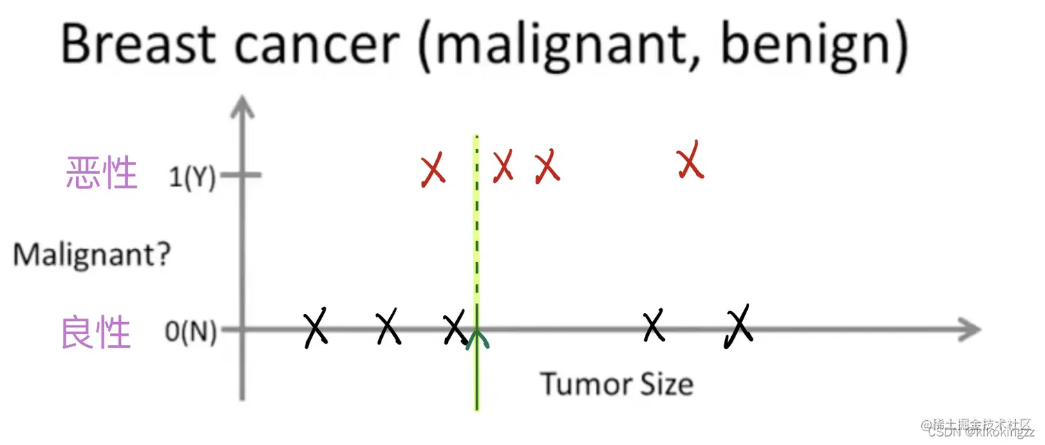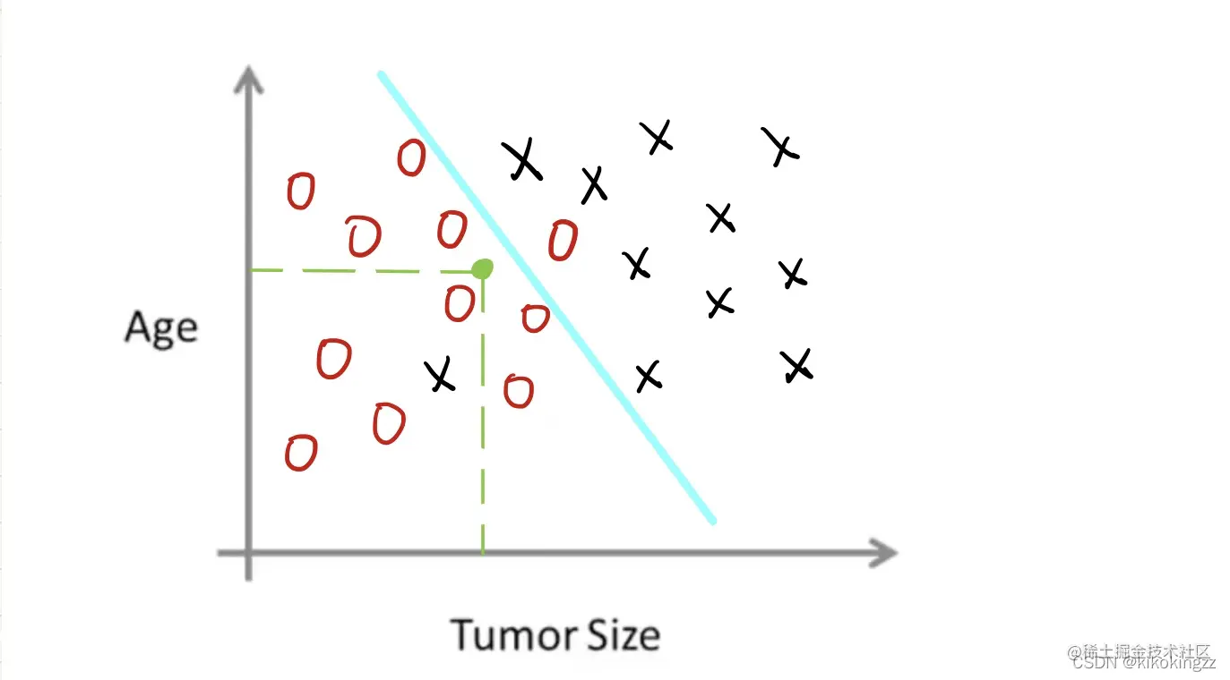假设该病人的位置位于上图绿色点,这时学习算法可能就会认为,该病人的肿瘤位于良性区域,因此良性的可能性会更大一些。