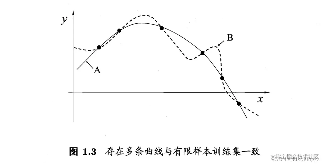 显然,对于有限个样本点组成的训练集,存在着很多条曲线与其一致。我们的学习算法必须有某种偏好,才能产出它认为“正确”的模型。