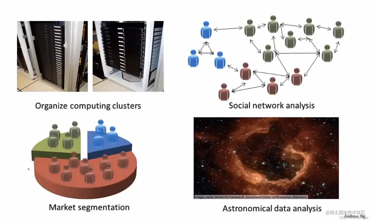 (1)组织大型计算机集群: 在一些大型数据中心,试图找出哪些机器趋向于协同工作,如果你把这些机器放在一起,你就可以让你的数据中心更高效地工作。
