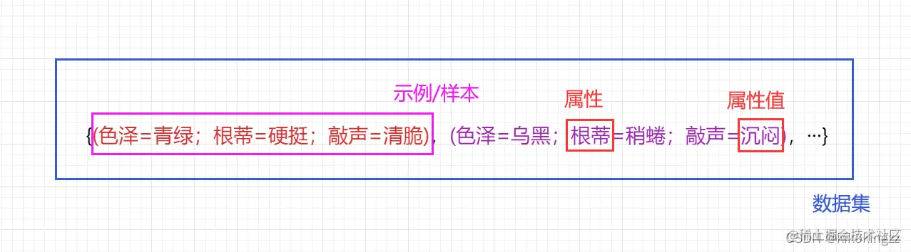 属性值(attribute value): 属性上的取值,例如上述示例II对于“敲声”这个属性的取值为“沉闷”。