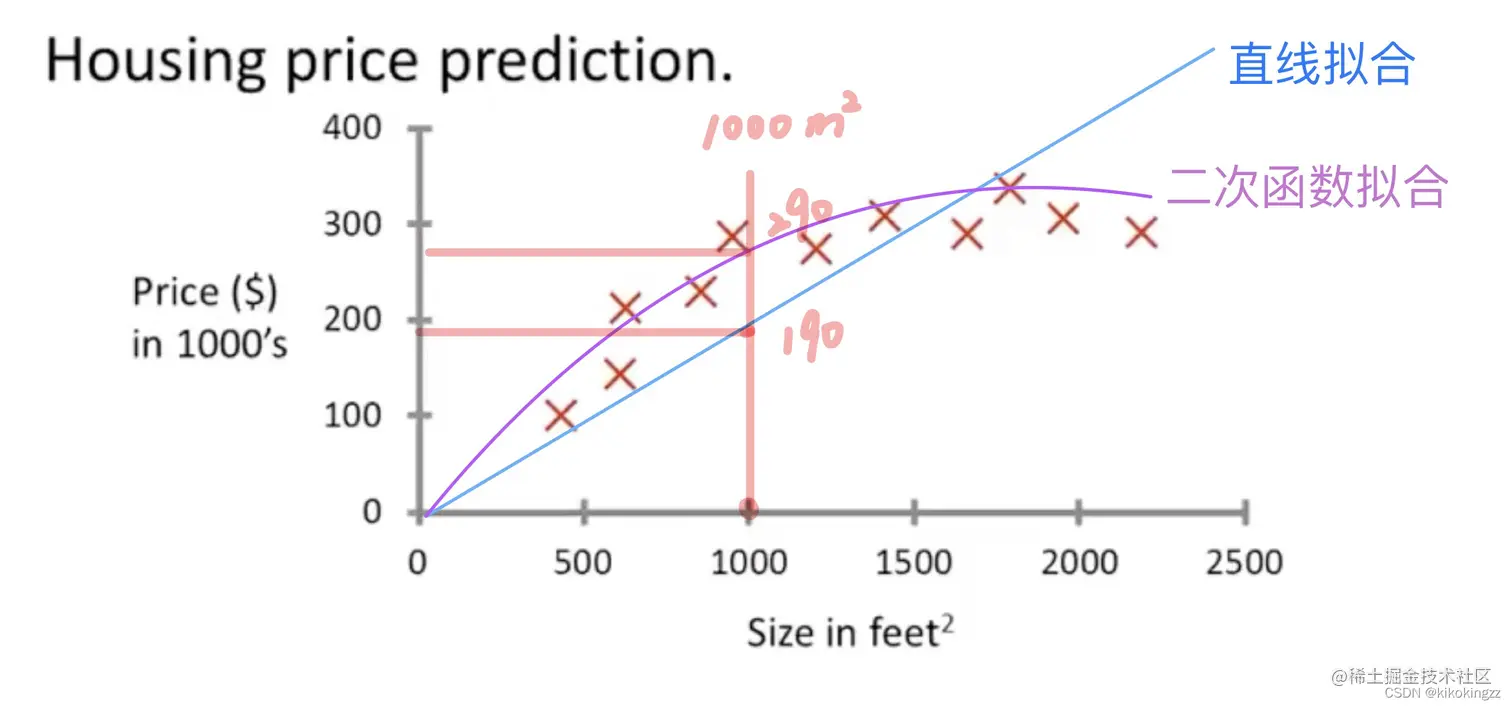 上例中我们使用了两个属性,横轴为房子的面积属性,纵轴为房子的价格属性。我们给了计算机一个房价数据集,在这个数据集中的每个样本我们都给出正确的价格(上图中的这些×)。算法的目的是通过已有的数据来给出更多的正确答案,例如本例,学习算法需要为这栋房子(1000平)给出一个正确的估价,它可以采用直线拟合或二次函数拟合的方式,来进行估价。采用直线拟合的估价为190w,采用二次函数拟合的估价为290w。