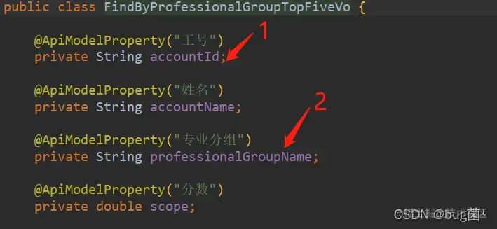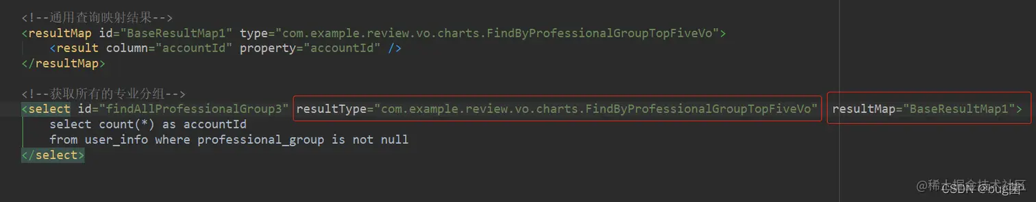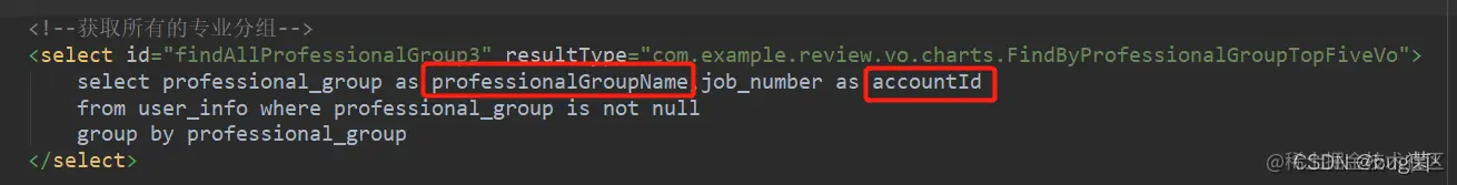 type:最终要映射的实体类pojo。比如:FindByProfessionalGroupTopFiveVo。 column: 库表的字段名。比如:professional_group、job_number。property:实体类pojo里的属性名。比如:professionalGroupName、accountId。