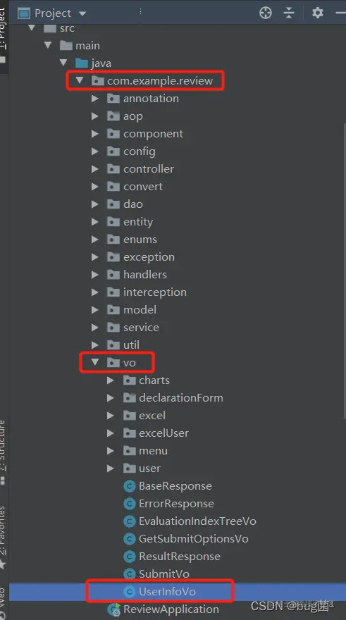 其中resultType指定的是返回该对象的相对地址,比如你参考下我的项目中UserInfoVo对象的目录地址,你就会明白了,大家请看: