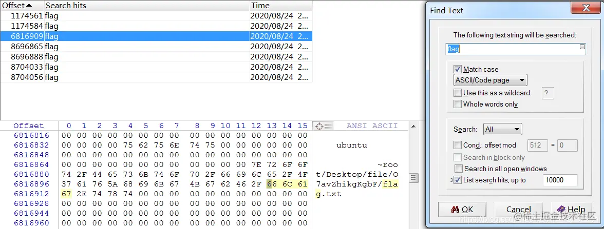 拿到附件,使用winhex分析一下,ctrl+F搜索flag字眼,找到flag.txt所在的文件目录