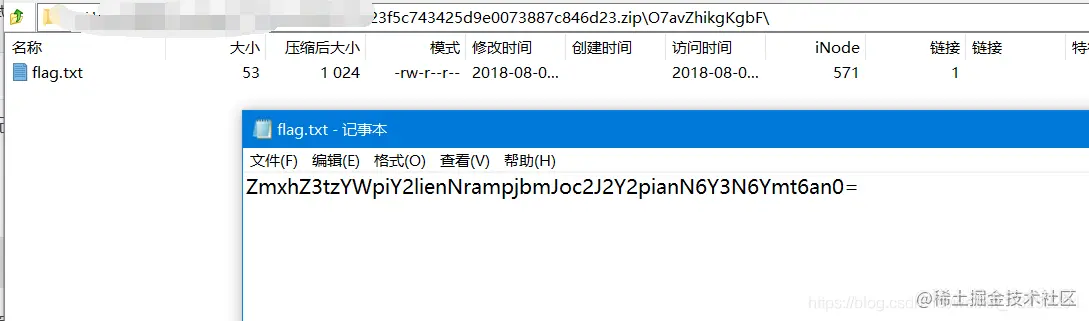 添加.zip后缀,使用7z(笔者这里尝试用winrar失败了)解压缩工具打开该压缩文件,找到)07avZhikgKgdF目录下的flag.txt,打开即可得到密文