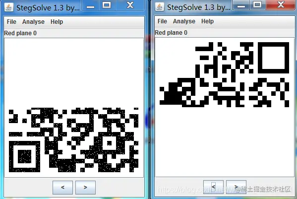 使用stegsolve工具分析这两张图片,得到两张二维码的图片,