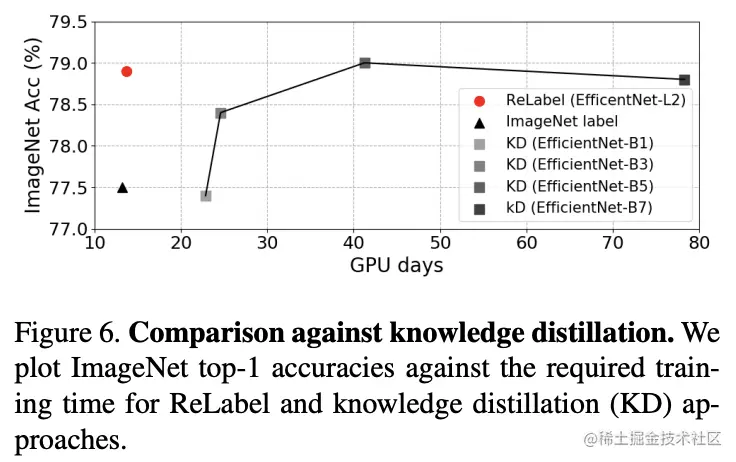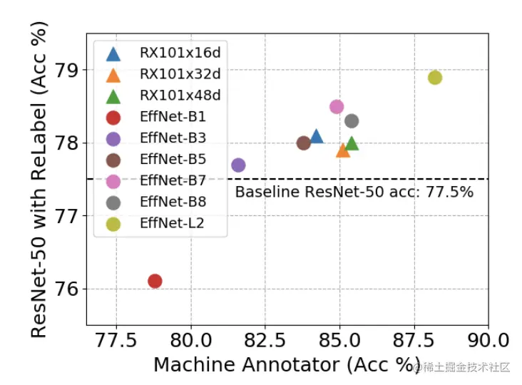 不同标注网络对ReLabel的效果影响很大,论文对比了多种网络结构,结果如上图所示,最终论文选择了EfficientNet-L2作为标注网络。