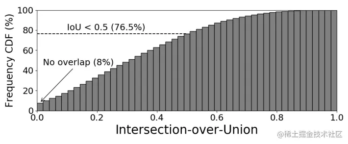 ImageNet数据集是图像识别领域很重要的数据集,数据集本身假设图片中只有一个目标,但是目前发现其中包含了很多噪声数据,很多图片实际上可能存在多个类别目标,这种情况就会误导网络的学习。此外,论文发现常用的Random crop数据增强方法会加剧这一现象,对验证集的每张图片进行100次Random crop,统计裁剪图片与原目标之间的IoU,结果如上面的图所示,IoU低于0.5的占比为76.5%,IoU为0的占比甚至高达8%,这显然会给训练带来极大的干扰。