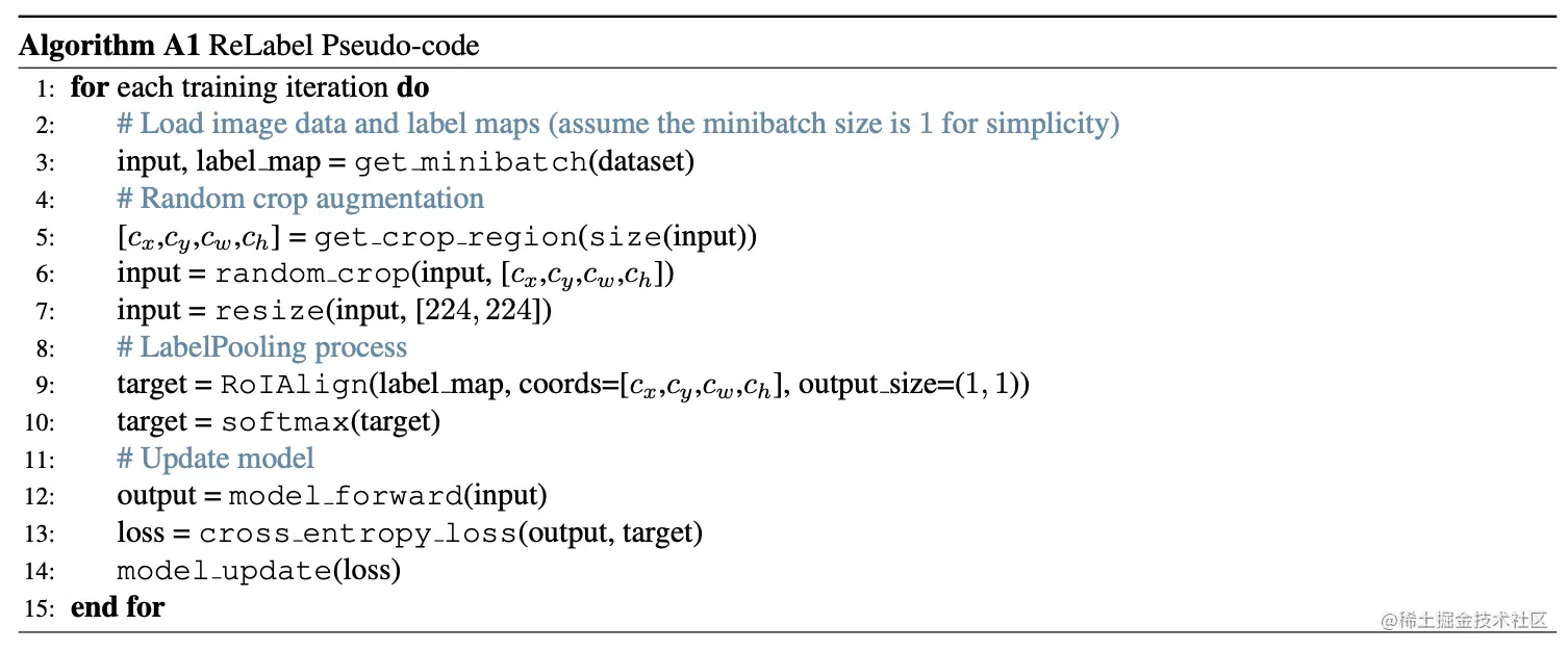 使用ReLabel的训练流程可参考上面的伪代码,由于pixel-wise多标签标注是预先计算好的,所以采用ReLabel带来额外计算非常小。