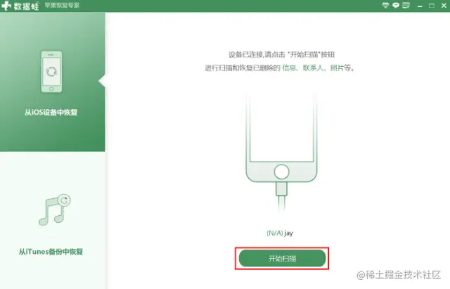 第1步:首先需要使用数据线连接手机,接着在根据界面的提示来选择【开始扫描】的选项进入扫描的阶段;