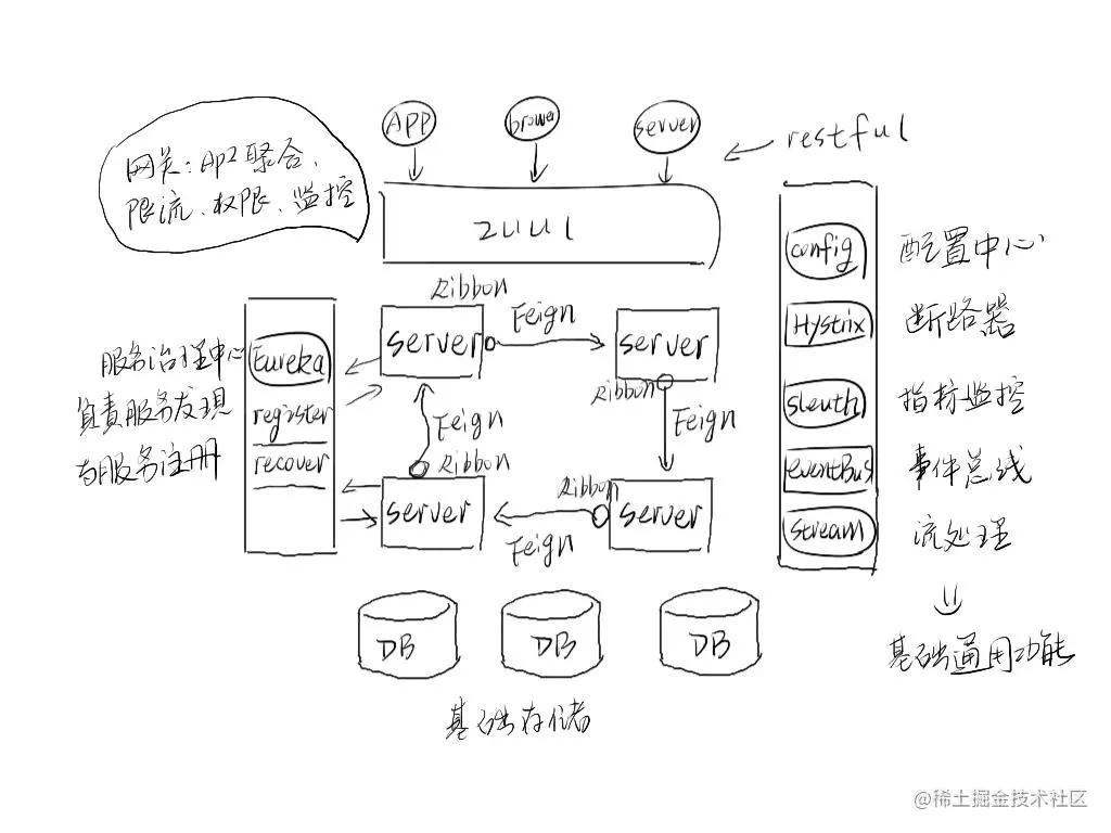 随着微服务的流行,微服务的很多问题也被越来越多的框架和服务解决掉了。我们以 Spring Cloud 技术栈为例: