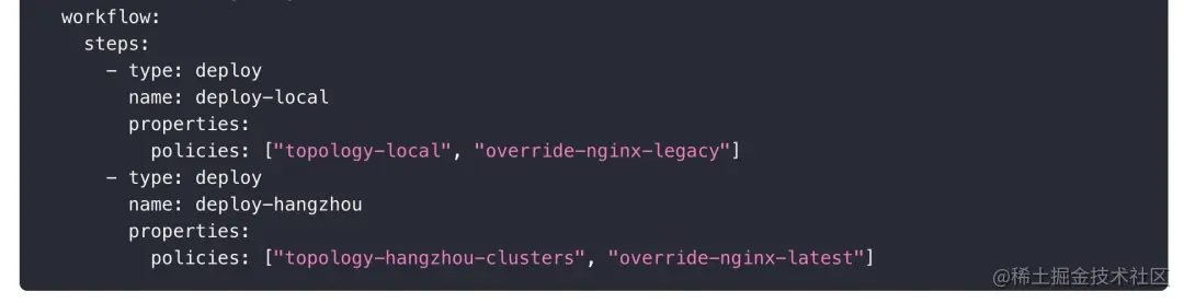 KubeVela 支持灵活的差异性配置策略,可通过组件属性、Trait 等形式来配置差异。如上图所示第三个策略表达了组件选择能力,第四个策略表达了镜像版本差异。我们可以看到,描述差异时没有指定目标,即差异性描述是可以复用的,它与目标策略在工作流步骤中进行灵活组合。