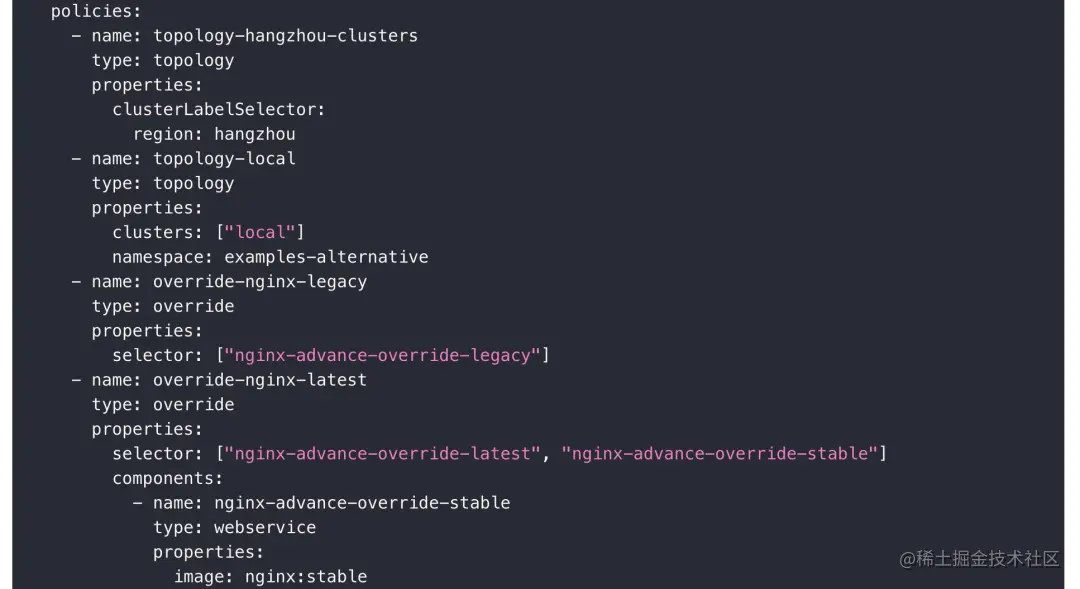 应用统一描述之后,不同的集群部署时可能存在差异,如不同的区域采用不同的环境变量、不同的镜像仓库地址;又比如不同的集群部署不同的组件、或者一个组件在多个集群部署互为高可用等。针对这类需求,我们提供了部署差异描述策略,如下图 6 所示,这是应用配置的策略部分,第一和第二条 topology 类型的策略以两种方式定义了两个目标策略。第三差异性策略,代表只部署指定的组件。第四条差异性策略,代表部署指定的两个组件和其中一个组件的差异性镜像配置。