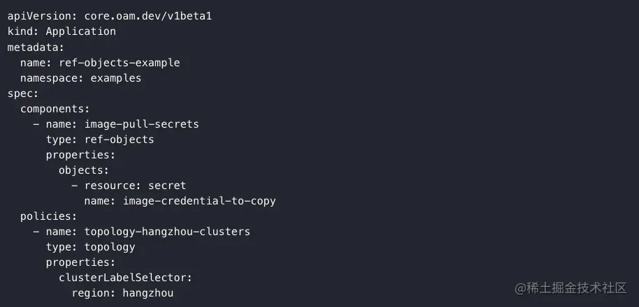 当然,图 4 所示的应用描述是完全以 OAM 推荐规范来的,如果你的现状是应用已经以 Kubernetes 原生资源的形式定义,不用担心,我们支持内嵌或引用的方式继承 Kubernetes 原生资源的描述风格,如下图 5 “引用 Kubernetes 资源做多集群部署”所示,描述了一个特殊应用,它的组件是依赖了一个管控集群中存在的 Secret 资源,将其发布到标签为 region=hangzhou 的所有集群。