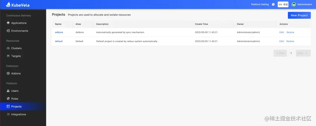 在 VelaUX 中,我们引入了基于“项目”的概念来进行逻辑的多租隔离,包括应用交付目标,应用和环境,成员和权限等。当企业中存在多个团队或多个项目组同时使用 VelaUX 平台发布各自业务应用时该能力变得非常重要。图 9 所示为项目列表页面,项目管理员可根据团队需求在该页面创建不同的项目,从而分配对应的资源。