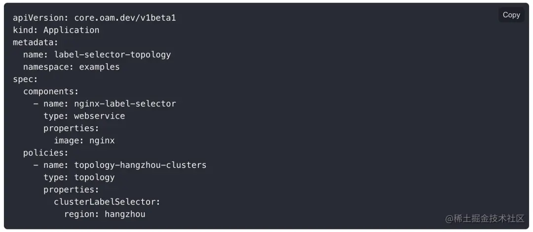 KubeVela 天然建立在多集群基础之上,对于同一份应用描述,我们只需要在交付策略中指定需要交付的集群名称,或通过标签筛选特定集群即可,如图 4 所示应用配置代表将一个具有一个 nginx 组件的应用发布到标签为 region=hangzhou 的所有集群。