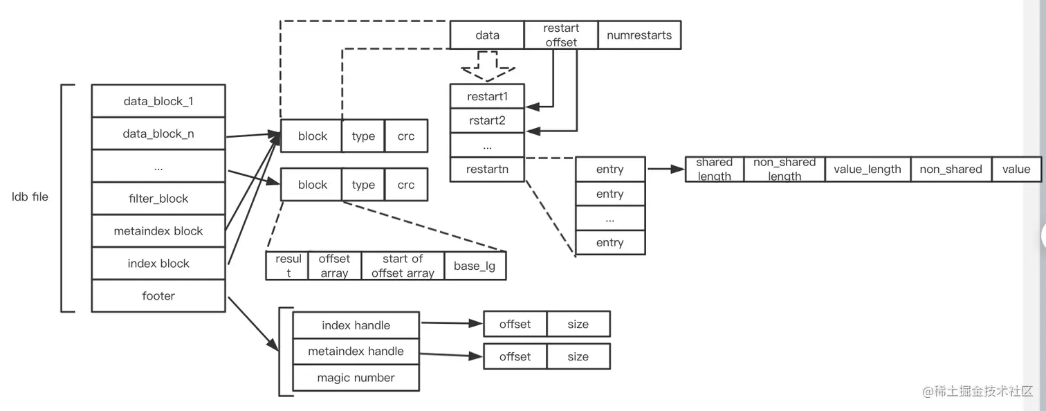 metaindex_block为filter_block的index数据,结构同data block只记录了一条数据,key为过滤器名称格式:filter.xxx,value为filter block的size和offset