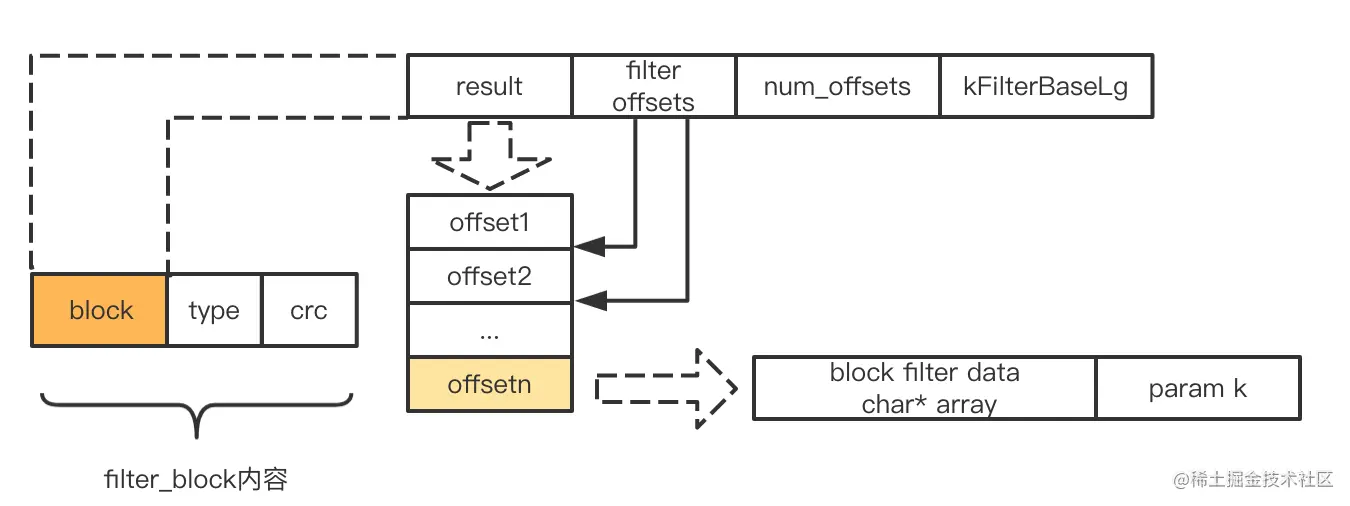 每写一个data block会调用一次GenerateFilter函数,将(block filter data+参数k)写入FilterBlockBuilder的result_中,并记录其在result_中的开始位置到filter_offsets_