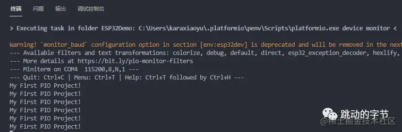 刚下载进去,发现串口输出的数据不对,我们启动串口监视器的时候,默认是9600波特率的,所以我们需要在配置文件platformio.ini添加一行配置信息monitor_baud = 115200,就可以正常输出了。