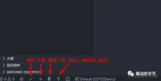 非常简单,看下图,VScode最下面有几个图标,一个对号的就是编译的,向右箭头的就是下载的,最右边有个小插头那个就是输出监视器的,我们可以用它来查看串口的输出数据。