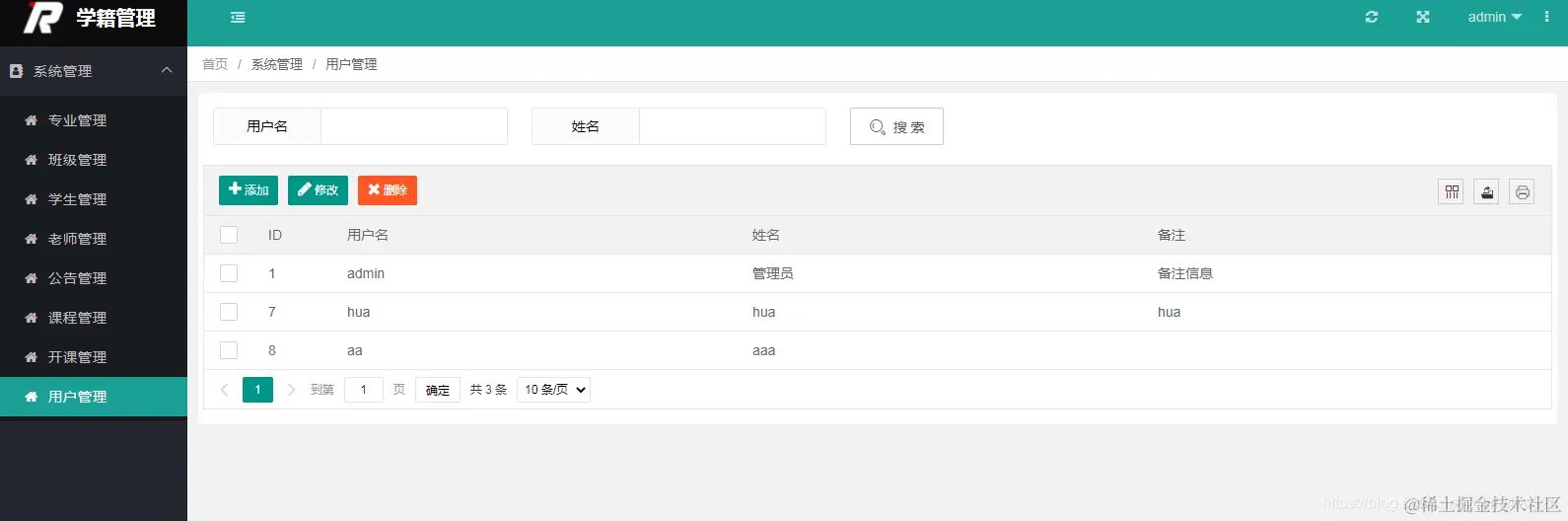 本系统具有三种用户: 1.管理员:专业管理,班级管理,学生管理,老师管理,课程管理,开课管理以及用户管理 2.教师:成绩管理,学生查询 3.学生:选课管理,查看成绩